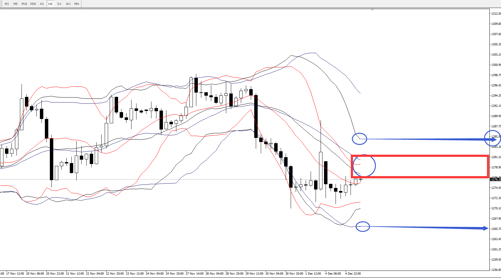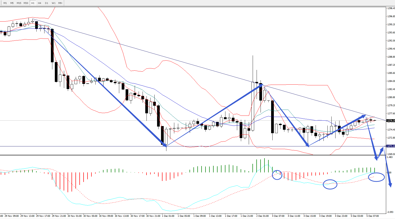 4小时图,目前价格受压于周期分别为21、26布林轨的中轨以及周期14布林轨的上轨,日内短线上价格若能反弹到1277-1281一带,可考虑进行短空,止损放21周期布林轨上轨上方1285一线,目标看26周期布林轨下轨支撑1266一线。
