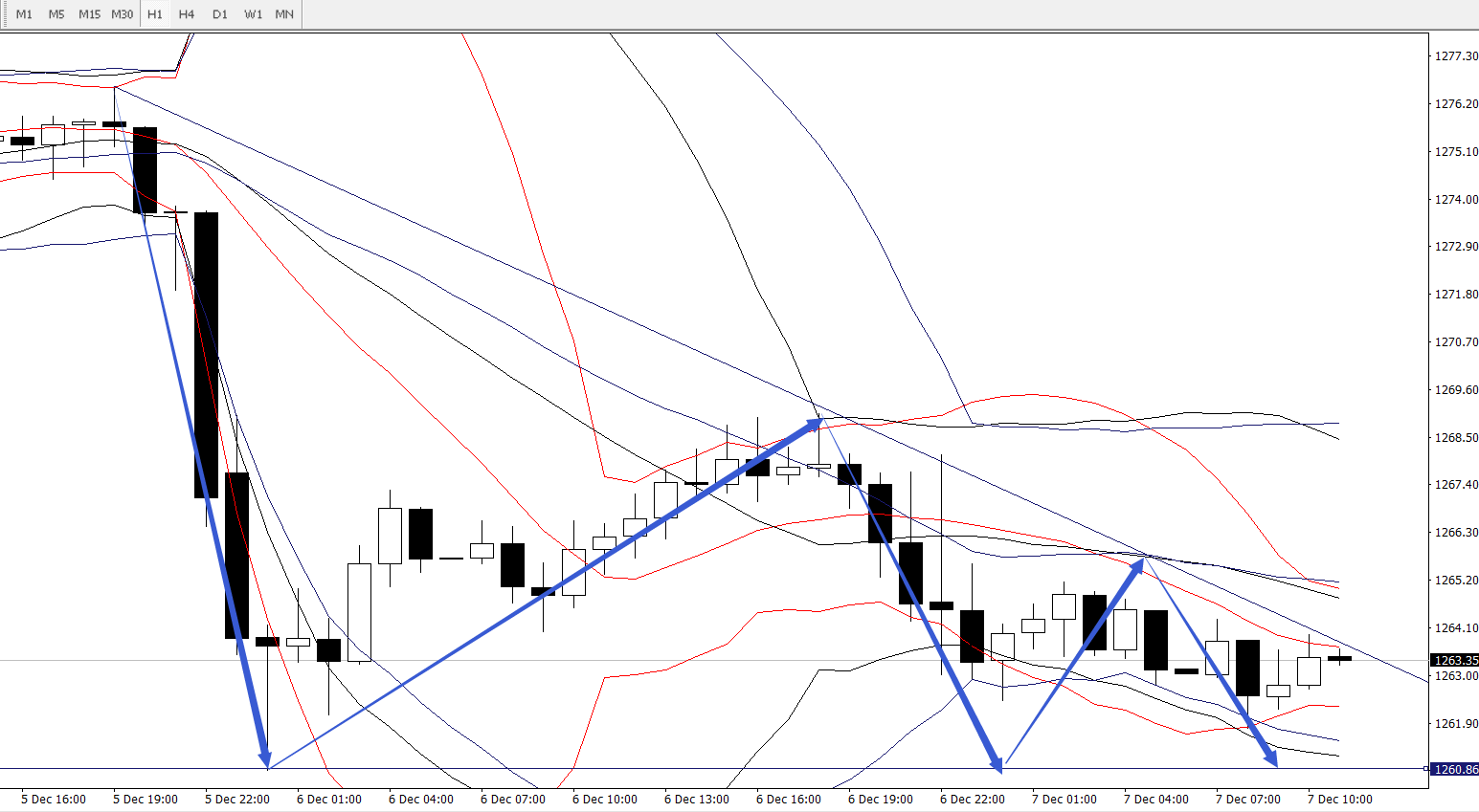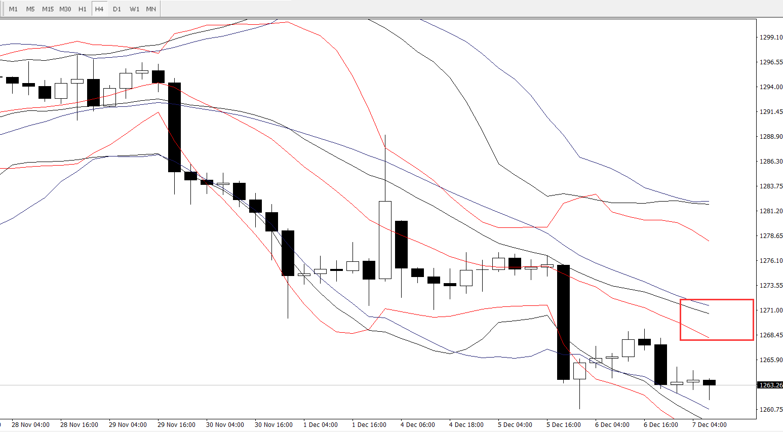 4小时图,目前价格短线上受撑于周期分别为14、21、26布林轨的下轨区间1258-1262,上方要重点关注前期小平台的一个压力情况,而1268-1271该区间也是各周期布林轨的中轨位置,日内短线上若能反弹到该区间,建议逢高沽空,快进快出。