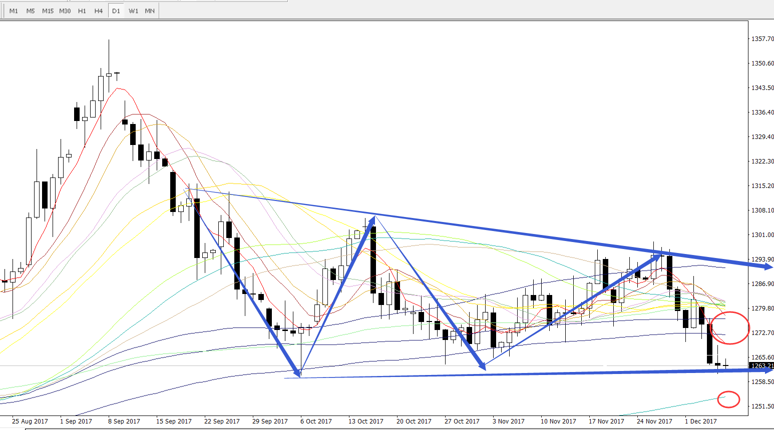 日线图,昨日日线仍旧收线于大级别整理结构的下轨上方,并没能有效的实现下破,所以短空一定要谨慎!日内,上方重点关注200日均线1272美元以及150日均线与10日均线的交叉点1277美元这两线的一个压力情况,下方重点关注300日均线的支撑1254美元一线。