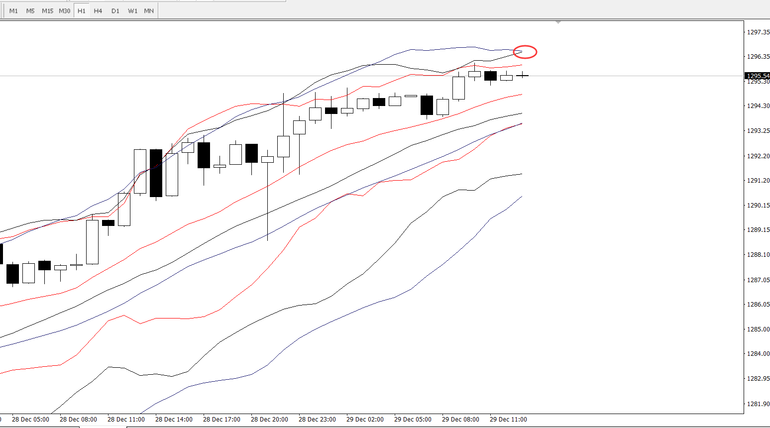 小时图,目前短线价格上多头上涨攻势有所放缓,且周期分别为14,21,26布林轨有同时开始走横的迹象,当前要重点关注上方周期分别为21,26布林轨上轨的交叉点1296.5一线,短线上该位置若能守住,那么在欧盘时段不排除先走出一波短线回调的行情走势。若多头继续保持强劲且快速上破1296.5一线,那么上方则要重点关注1300整数关口。
