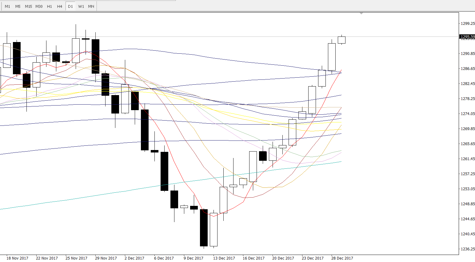 在此前美国经济数据较预期疲弱后,美元抛售压力增加,而围绕美国国债收益率的温和回调,也进一步加剧了美元的疲软,美元指数更于昨日凌晨创出新低,最低录得92.57,随着美元的持续走低,黄金于昨日进一步抬高整体价格走势,于开盘后继续震荡上行,并于凌晨收盘前创出新高,最高录得1295美元。日内参与短线的投资者需要提防的是今日是2017年的最后一个星期五,再加上是年关,周线,月线,季线,年线的收线位置都将成为市场多空主力的争夺重点,所以短线上多空行情料将更为惨烈,建议投资者特别是在收盘前轻仓操作,控制好风险。