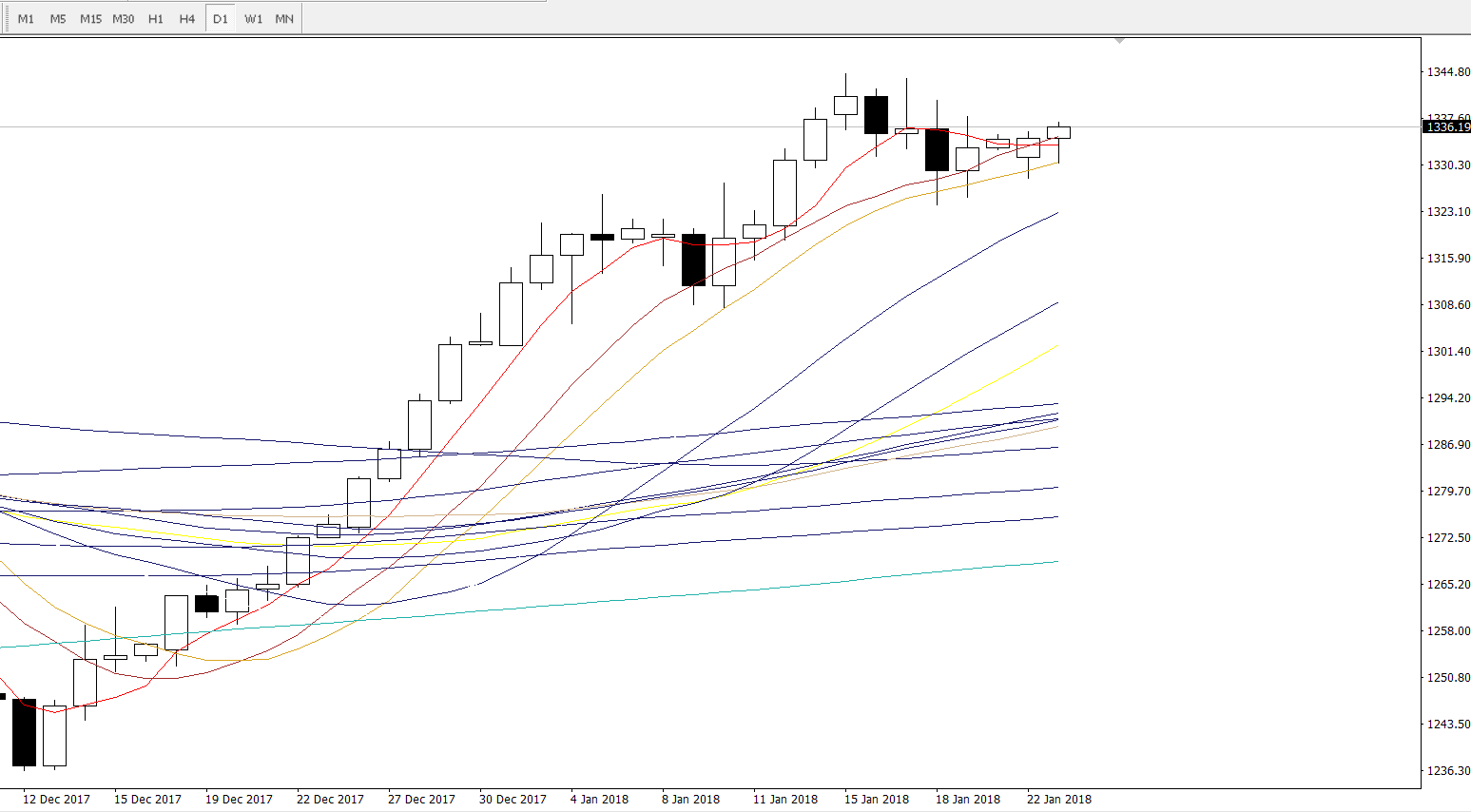 昨日黄金于周一的行情里头不出意外的走出了一个窄幅震荡的行情走势,最高触及1335.5美元,最低录得1328.3美元,目前短线上多方占据一定的优势,特别是昨日的日线是踩了一下13日均线后向上收了根带有下影线的小阳K。但目前多方短线上在创出新高前还不能大意,毕竟目前市场基本面上仍存在较多的不确定因素,不排除黄金空头会趁机砸盘。所以短线上尽可能等待低位再去做多单的介入动作会相对稳妥一些。