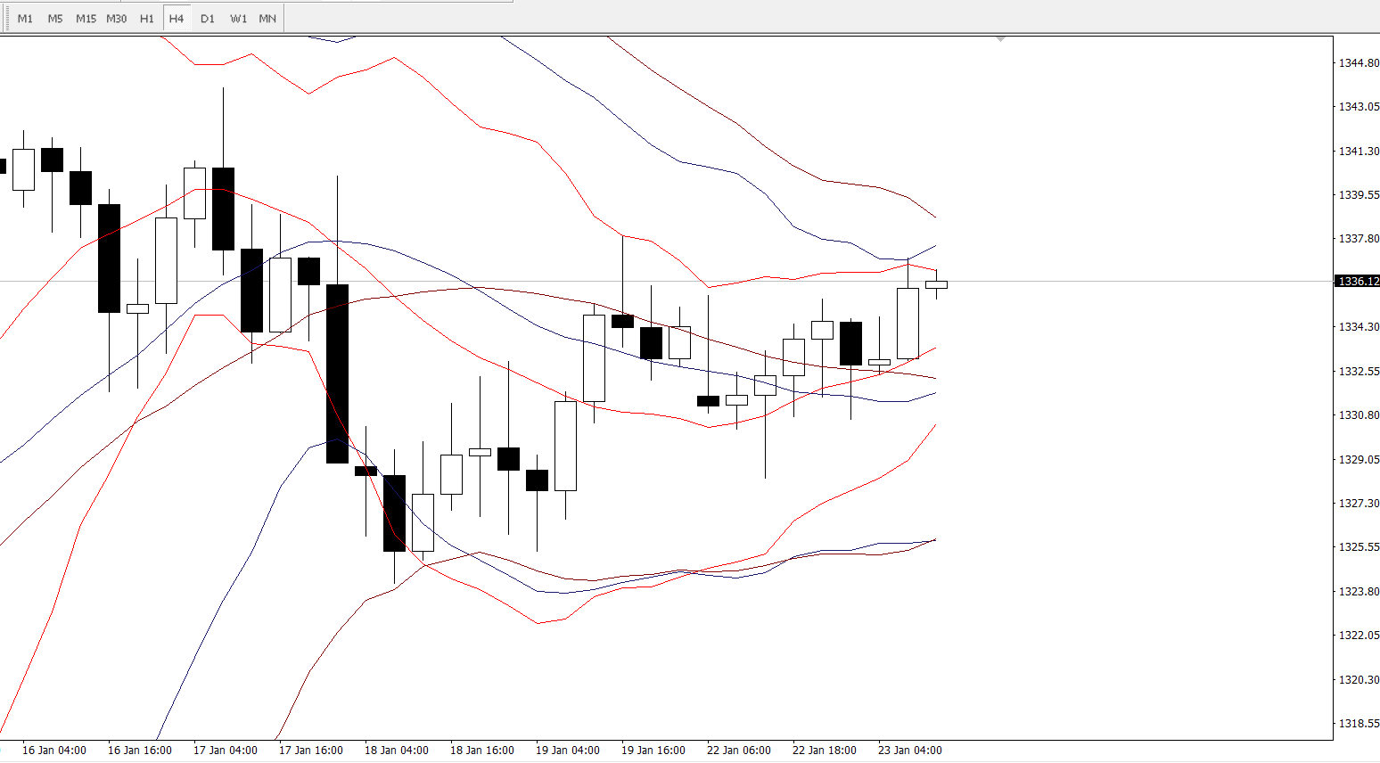 4小时图,目前短线上需要留意的是周期14、21、26布林轨在同时收口,且当前价格短线上受压于周期14、21、26布林轨的上轨区间1336.5-1338.5,该区间若能上破,那价格短线上或将快速上行至1340上方,所以需要重点关注。目前周期14、21、26布林轨的中轨区间1331.5-1333.5,稳健者可于该区间尝试低多短线布局。