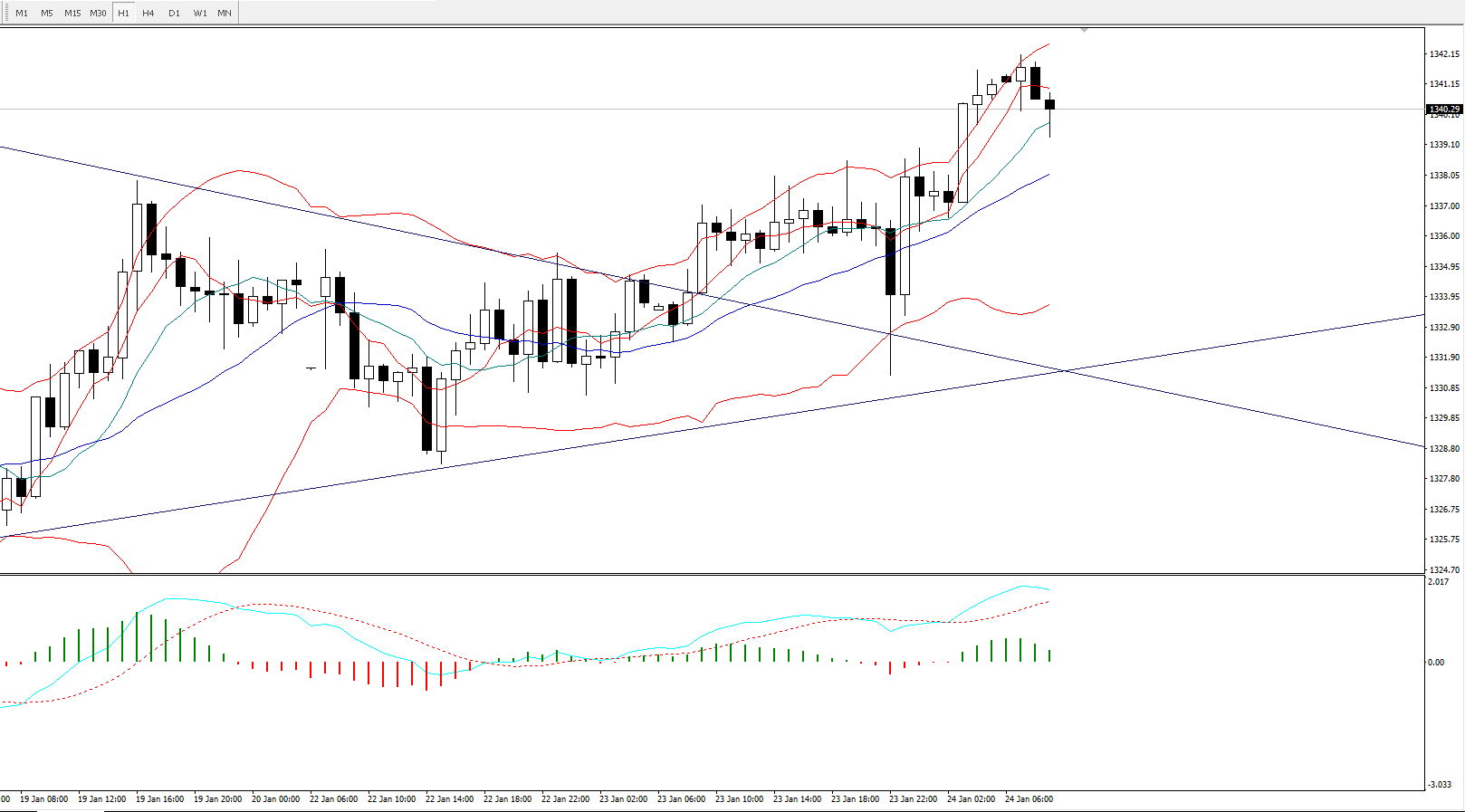 从1小时图来看,目前价格已经顺利回踩整理结构后继续上攻并成功上破1340一线,且布林轨开口向上,均线系统呈金叉向上扩散,MACD快慢线及柱体仍运行于零轴上方,短线上整体偏多。亚欧盘需留意1338一线的支撑情况,该位置刚好是小时图布林轨的中轨。