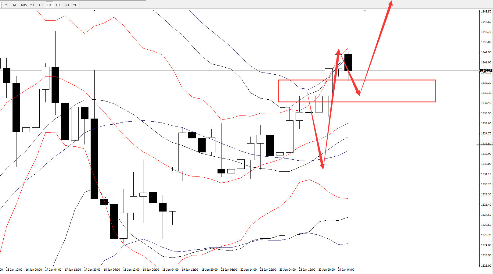 4小时图,昨日短线上亚欧盘受压于周期14、21、26布林轨的上轨区间1336.5-1338.5,并于美盘进一步加大回落力度跌至昨日的布林轨的中轨区间1331.5-1333.5,随后价格进一步上攻并成功站上1340上方。日内激进者可于昨日的上轨区间1336.5-1338.5轻仓布局多单,稳健者可等价格回落至今日的布林轨的中轨区间1333-1335.5再去布局。