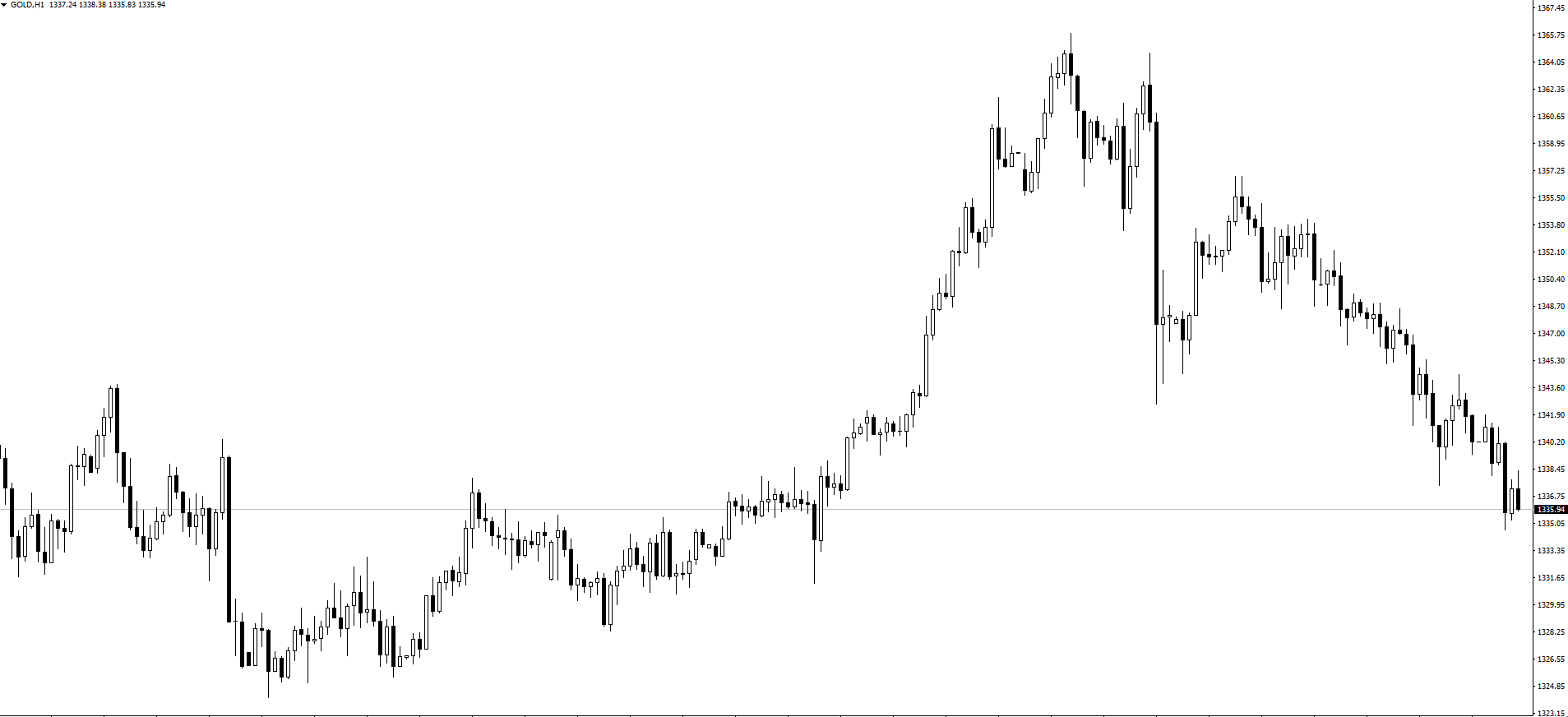 【黄金小时图】上图是黄金1小时分析走势图。昨日受制于美元底部反弹,黄金日内走出震荡单边下行行情,跌幅超10美元,日线收出大阴线。从小时图技术面走势来看,黄金此时处于下行趋势之中,并且空头下行力度较强。同时,当前阶段黄金已经由之前的上行趋势转变为下跌走势,接下来即看下行为主;这一点在昨日评论中已经提示黄金短期走弱,有小头部迹象,操作上需要转变思路。