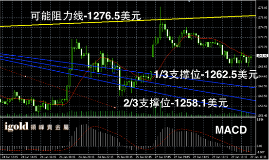 黄金短线阴阳烛录得柱体较短,后期小幅回落至红色日平均移动线下方,短线MACD显示弱势空头主导,后期黄金价格或在1260 – 1270 美元区间偏空震荡。