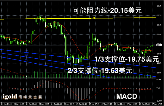 白银阴阳烛录得柱体较短,且整体处于红色日平均移动线中位,短线MACD显示呈中性,白银价格后期或从19.5 – 20美元区间窄幅整理。
