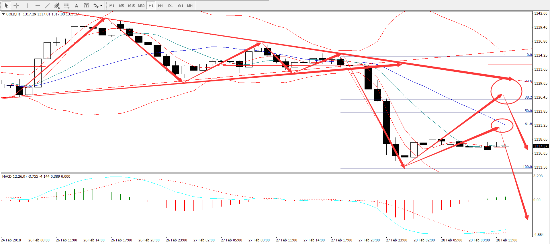 从1小时图来看,目前短线上价格已经成功下破前期楔形整理结构的支撑区域以及前面小级别的三角整理结构,当前布林轨于昨日收口再次开口向下,短线价格要重点关注布林轨中轨位置1321一线的压力,该位置也是斐波纳0.618的关键反弹位,若日内反弹力度较大,不排除价格会去上摸斐波纳0.5及0.382的压力区间1323.5-1326。短线均线系统信号明显呈空头死叉,MACD的快慢线处零轴下方但已经出现低位叉点,且柱体回到零轴附近,短线上整体偏空,但日内要关注短线的一个反弹力度,短线上建议逢高沽空为宜。