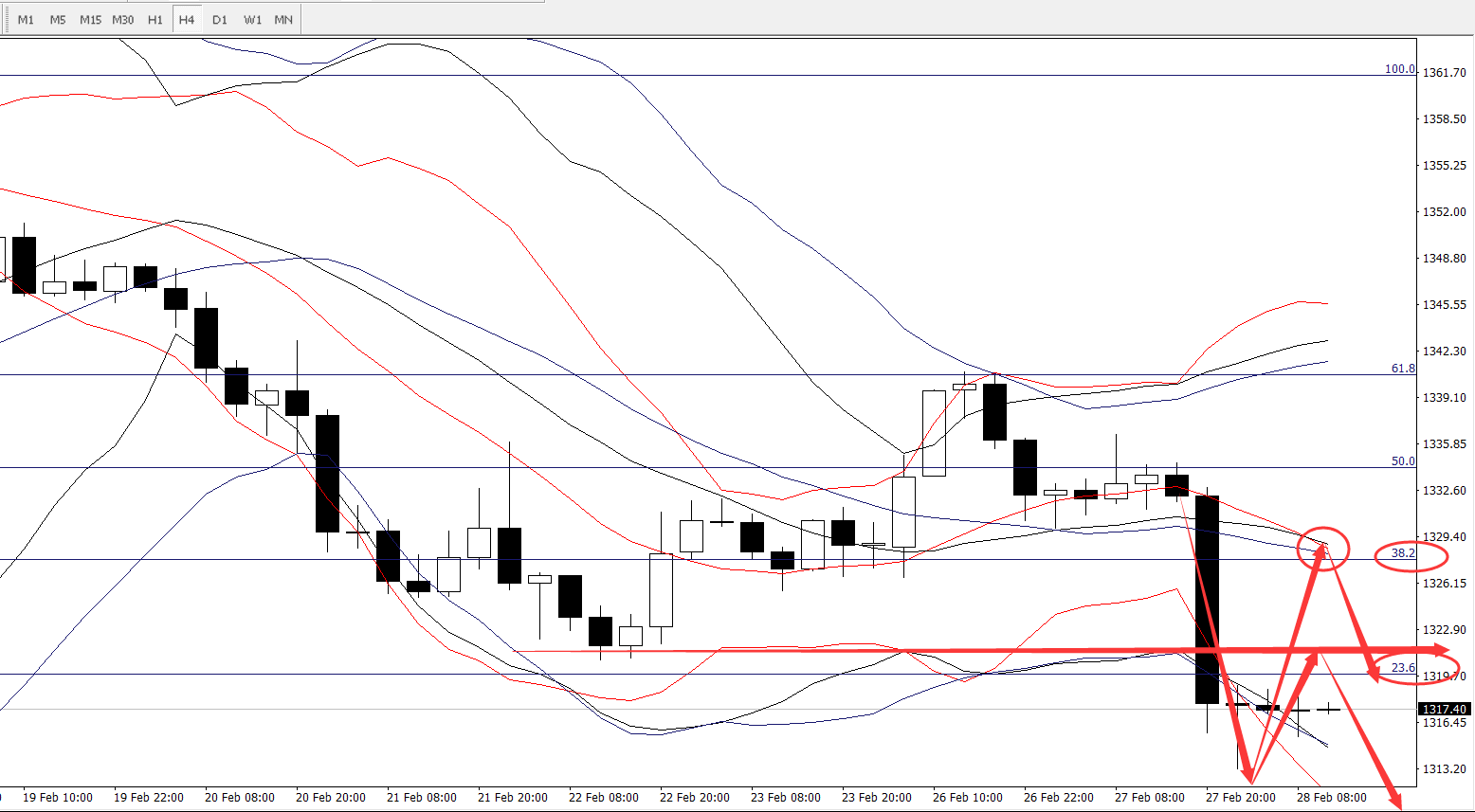 4小时图,短线上价格于昨日美盘时段成功下破周期分别为14、21、26布林轨的中轨后,价格加速下行,且以一根大阴的实体阴线成功下穿1321附近的前期底部。所以短线上要重点关注1321附近的压力情况。上方关键的压力位是在1328一线,一方面是前期斐波纳0.382的关键位置,另一方面是各周期布林轨的中轨位置。