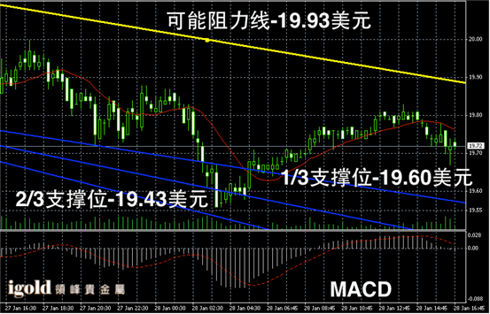 白银阴阳烛录得前后阴阳烛间隔出现,柱体整体偏空整理,短线MACD显示弱势空头主导,白银价格短线或在19.5 – 20美元区间宽幅整理。