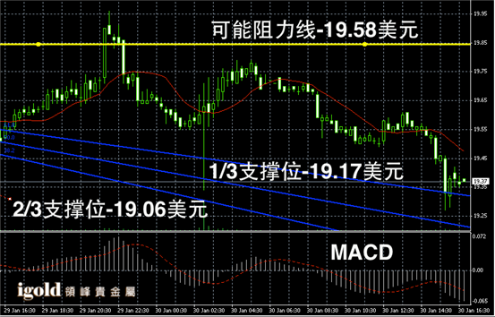 白银阴阳烛录得柱体开始回落,整体处于红色日平均移动线下浮,短线MACD显示弱势空头主导,后期白银价格或在19.6美元窄幅震荡。