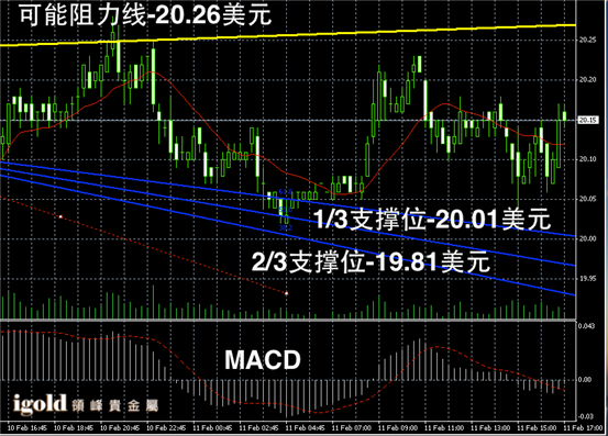 白银阴阳烛录得前后阴阳烛间隔出现,整体处于红色日平均移动线中位,短线MACD显示呈中性,后期白银价格或继续在20.1美元附近不断整理。