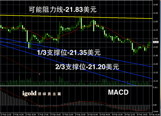 白银阴阳烛录得阴烛增多,后期柱体回落,低于红色日平均移动线,短线MACD显示弱势空头主导,不过白银柱体依然比较平稳,后期白银价格或在21.5美元附近窄幅震荡。