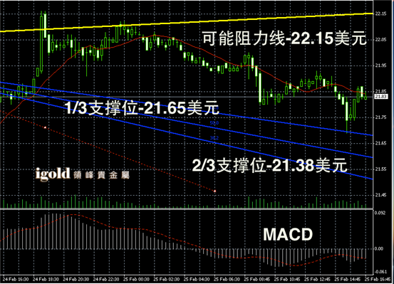 白银阴阳烛录得小幅上扬后,多头回落,后期柱体整体处于红色日平均移动线中位,短线MACD显示呈中性,白银价格或在21.8美元附近整理。