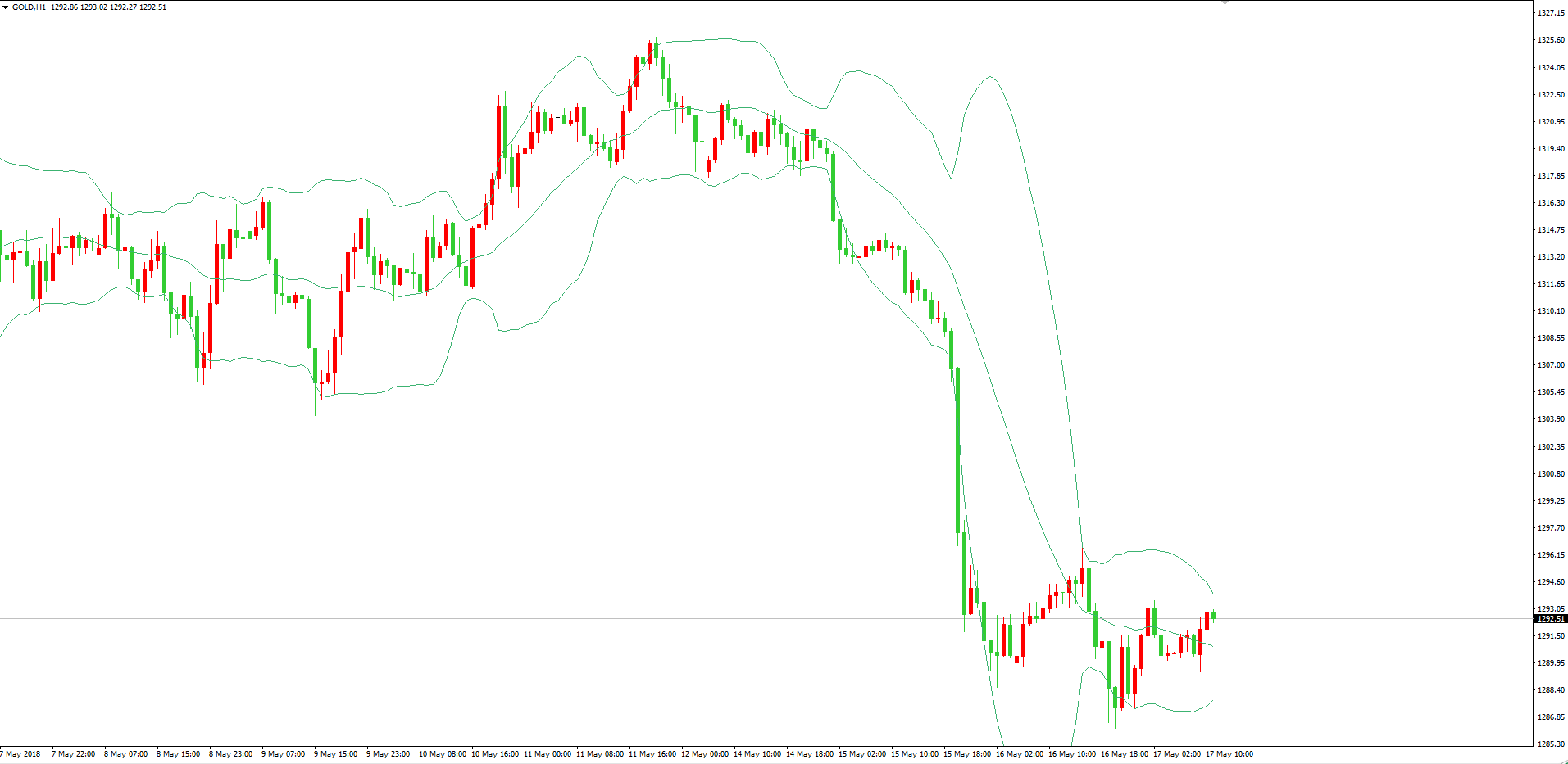 上图是黄金1小时走势图。目前可以看到,黄金经过下行之后,短线处于低位小区间震荡,此时已经小时级别BOLL线中轨,由于前期低点1286附近有较强支撑,预计接下来有反弹,故今日关注低位震荡,高抛低吸为主。