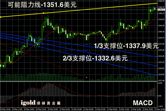 黄金阴阳烛录得后期阳烛增多,且短线MACD显示弱势多头主导,柱体整体处于红色日平均移动线上方,后期金价或在1340 – 1350美元区间不断持稳。