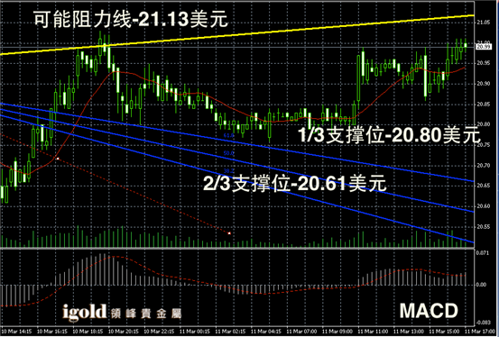 白银阴阳烛录得柱体小幅高于红色日平均移动线中位,短线MACD显示弱势多头主导,不过柱体离散率依然较大,后期白银价格或在20.5 – 21美元区间持稳。