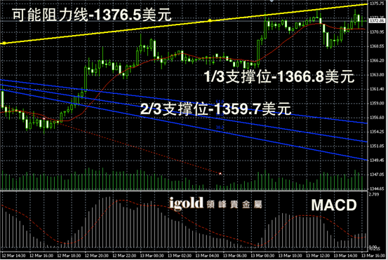 黄金阴阳烛录得短线跳涨的趋势依然明显,后期柱体录得阳烛依然较短,小幅高于红色日平均移动线,短线MACD显示弱势多头主导,后期金价或不断在1370美元附近持稳震荡。一旦能够持稳1375美元,则可能冲击1390美元附近。
