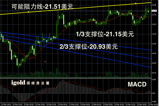 白银阴阳烛录得短线阳烛增多,后期柱体小幅高于红色日平均移动线,短线MACD显示弱势多头主导,白银价格或继续在21 – 21.5美元区间偏多整理。