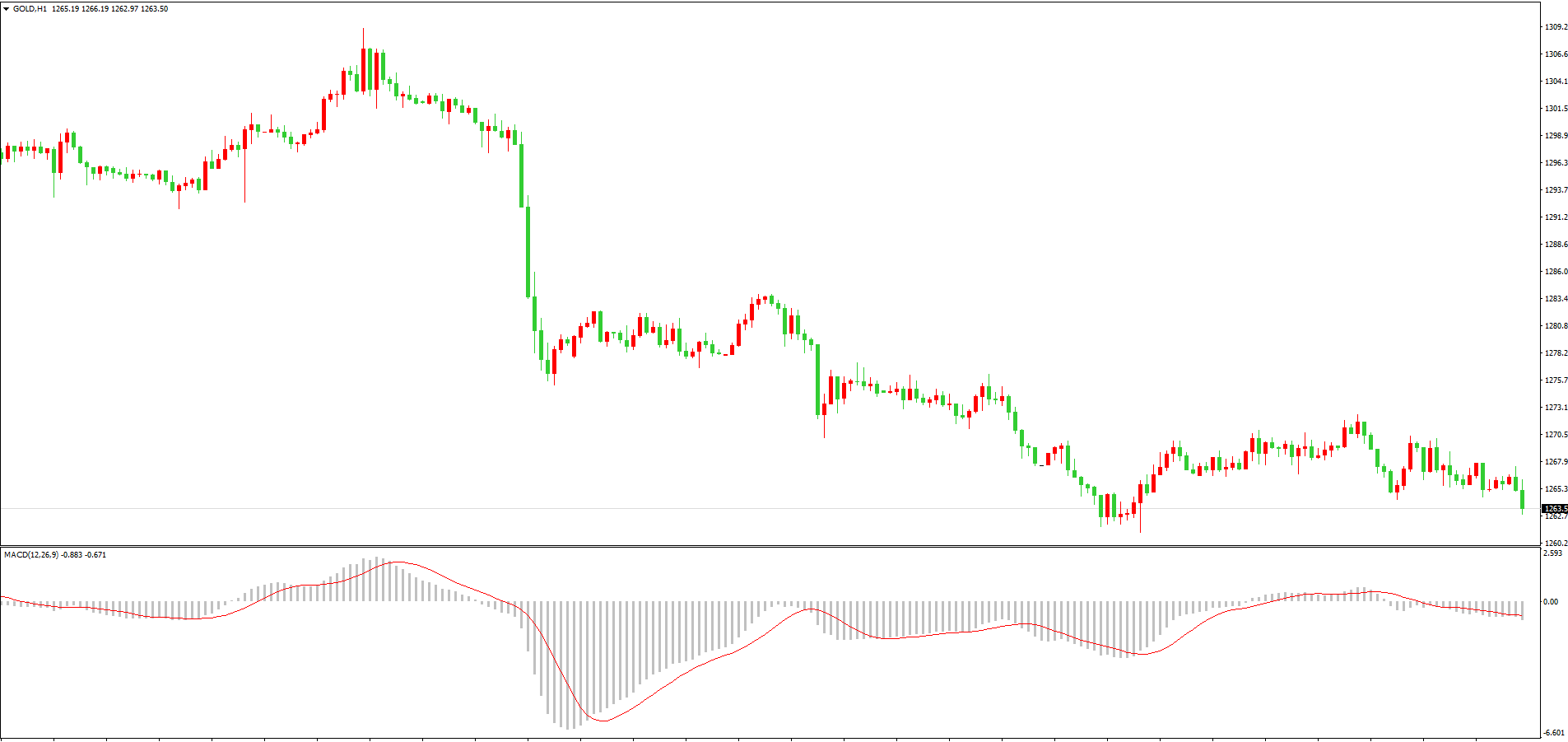 昨日黄金盘中继续保持震荡走势,全天波动仅8美元空间左右,亚欧盘波幅相对较大,而美盘却不断收窄。上图是黄金1小时周期走势图,可以看到,目前其走势上依旧处于前低1261美元至1270美元高点压力之间运行,趋势维持看空不变,短线虽较为震荡但总体保持向下特征,此时亦不具备企稳反弹信号,所以操作上建议顺势高空为主。