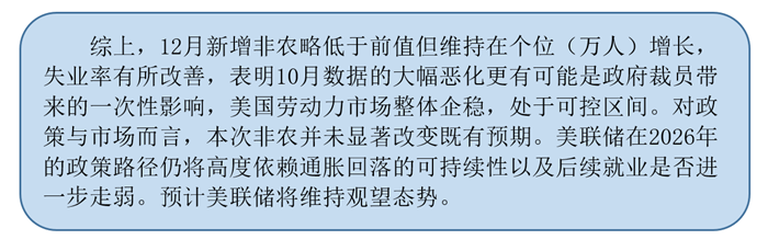 从细项数据来看,私人服务就业新增5.8万人,较前值回升,主要新增来源中:休闲和酒店业新增4.7万人,教育和医疗保健新增4.1万人。零售业裁员2.5万人,已经连续第三个月裁员,新增就业仍由少数行业贡献,就业结构继续恶化。12月政府部门就业人数增加1.3万人,其中联邦政府就业人数小幅增加2000人,自2025年1月以来联邦政府就业人数已经累计减少27.7万人,降幅达9.2%,后续政府部门对就业市场拖累可能会有所缓解。